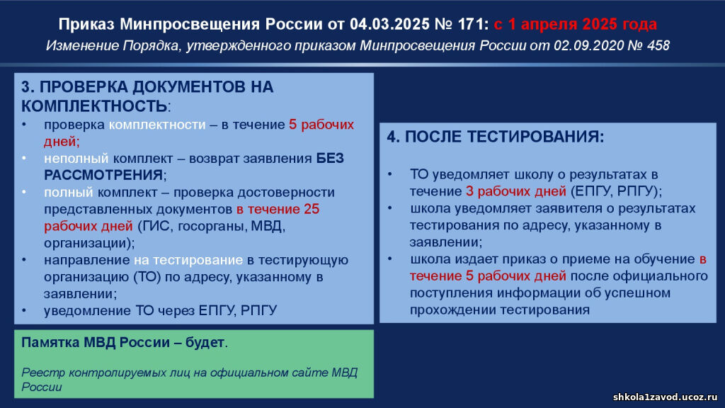 Приказ Министерства просвещения Российской Федерации от 04.03.2025 № 171 "О внесении изменений в Порядок приема на обучение по образовательным программам начального общего, основного общего и среднего общего образования, утвержденный приказом Министерства просвещения Российской Федерации от 2 сентября 2020 г. № 458"